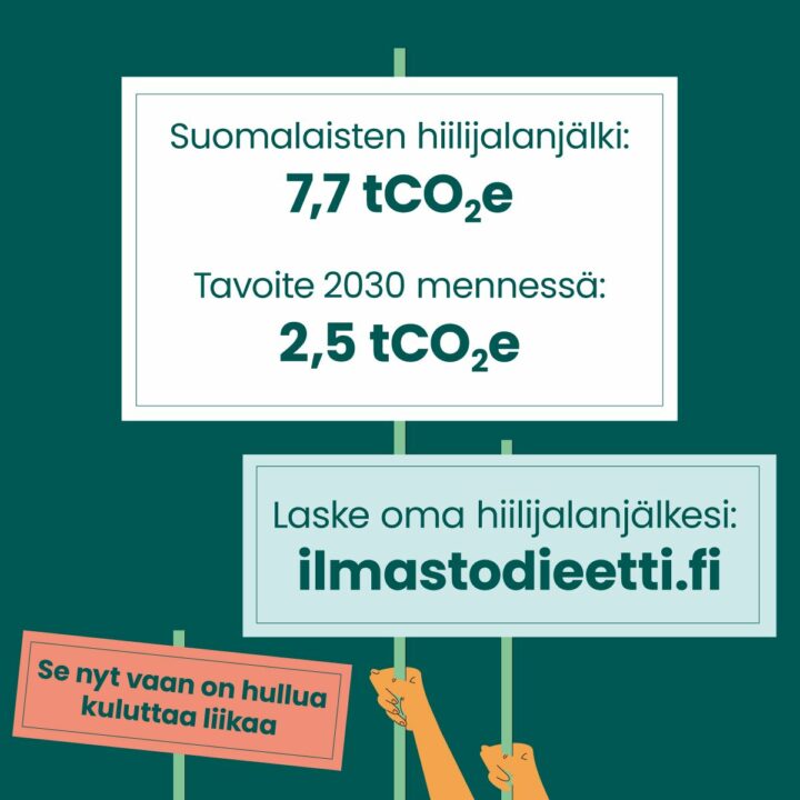 27.12.2024 Kotitalouksia tarvitaan ilmastotalkoisiin – Laske oma hiilijalanjälkesi Kotitalouksien hiilijalanjälki on laskenut tuntuvasti 2000-luvulla noin 14 hiilidioksidiekvivalenttitonnista (CO2e) 7,7 tonniin. Syynä ei kuitenkaan ole suomalaisten kulutustottumusten muutos vaan tuotannon kasvihuonekaasupäästöjen väheneminen niin Suomessa kuin ulkomailla. Suomen ympäristökeskus on päivittänyt Ilmastodieetti.fi-työkalun, jolla kotitaloudet voivat laskea oman kulutuksensa hiilijalanjäljen. ”Nykyinen kulutustasomme on kestämätön niin ympäristön, luonnon monimuotoisuuden kuin vesivarojemmekin kannalta. Päättäjillä, kunnilla ja yrityksillä on suuri vastuu kestävän elämäntavan edellytysten luomisessa liittyen muun muassa asumiseen, energiaan ja liikkumiseen. Mutta myös kotitalouksien on tärkeää muuttaa kulutustottumuksiaan ja pienentää hiilijalanjälkeään, jotta saavuttaisimme maapallon kantokyvyn kannalta kestävän tason…” erikoistutkija Eija Ferreira Suomen ympäristökeskuksesta sanoo. Uudistunut Ilmastodieetti.fi-laskuri auttaa arvioimaan oman hiilijalanjäljen: https://ilmastodieetti.fi/ Lue lisää: Syke.fi Jaa: Linkki kopioitu leikepöydälle