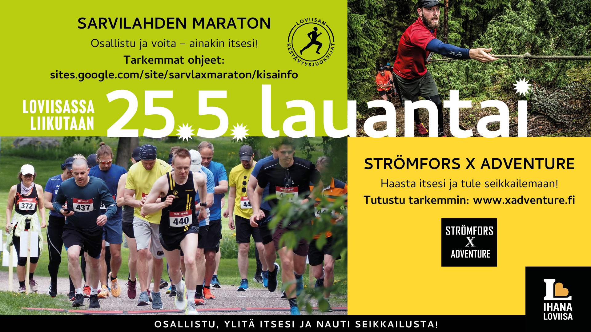 21.5.2024 Loviisassa liikutaan 25.5.2024! Sarvilahden maratonissa lähdetään liikkeelle Rauhalan puistosta ja Strömfors X Adventure starttaa Strömforsin ruukista. ? Sarvilahden maraton Osallistu ikimuistoiseen tapahtumaan kulttuurimaisemassa! Ennakkoilmoittautuminen on suljettu, jälki-ilmoittautuminen paikan päällä klo 10 mennessä kisapäivänä. Lue lisää ? Strömfors X Adventure Strömfors X Adventuressa liikutaan meloen, pyöräillen, jalan ja ehkä oikoen myös uiden. Reitin varrella on paljon erilaisia haasteita sekä tehtävärasteja (quest). Sarjoja niin aloitteleville seikkailijoille kun myös kokeneille konkareille. Lue lisää ja ilmoittaudu Jaa: Linkki kopioitu leikepöydälle