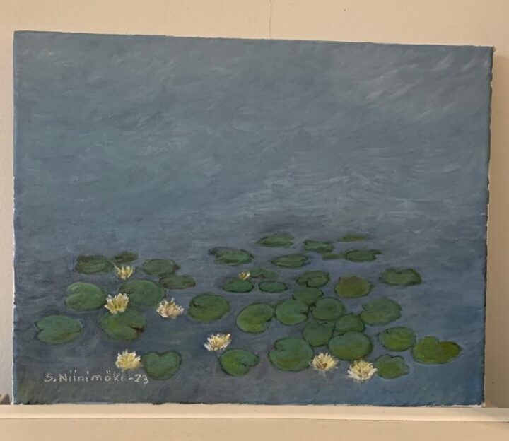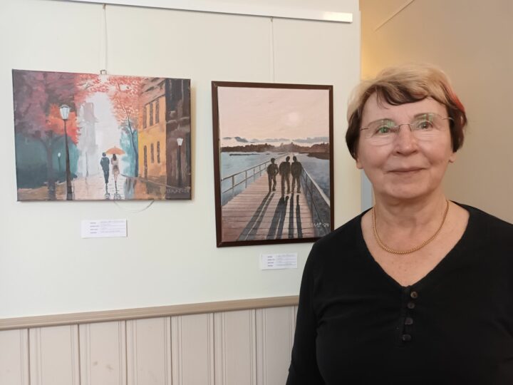 ”Sirkku Aho-Pulliainen on opiskellut taidetta opiston kursseilla jo useita vuosia. Hänen teoksiaan on ollut esillä Almintalolla kansalaisopiston vuosijuhlanäyttelyssä. Hän maalaa valokuvien pohjalta kankaalle akryylillä muun muassa teoksessa Sillalla. Vaaleanpunainen iltataivas on siirtynyt hienosti hänen siveltimestään kankaalle. Opettaja Terhi Penttilä muistuttaa miten eriväriset kehykset korostavat maalauksen värimaailmaa. Mustasävyiset kehykset tuovat esiin tummia kohtia. Taiteilija Aho-Pulliainen itse huomasi, että nämä kehykset sopivat Sillalla-teokseen parhaiten väärin päin.”