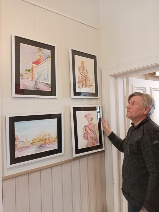 ”Heikki Arola on käynyt kurssilla viitisen vuotta. Hän oli työreissulla Raumalla ja nappasi kuvan Vanhasta Raumasta raatihuoneineen ja etualla näkyvine luurankopaitaisine mopoilijoineen. Kuva näytti hyvältä, joten Arola päätti maalata siitä vesiväriteoksen vaikkei ollut melkein 30 vuoteen akvarellia käyttänyt. Arolalla on ollut edellisvuonna näyttely kansalaisopiston tiloissa, sillä opiston tiloja voivat kurssilaiset käyttää omien näyttelyiden pitämiseen ilmaiseksi. Myös näyttelyä katsomaan pääsee ilman maksua.”