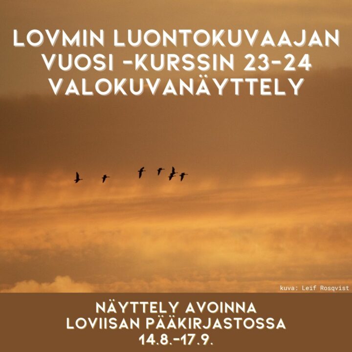 Tule tutustumaan luontokuviin Loviisan kansalaisopiston Luontokuvaajan vuosi -kurssilta 14.8.-17.9.! Näyttely on avoinna kirjaston aukioloaikoina.
