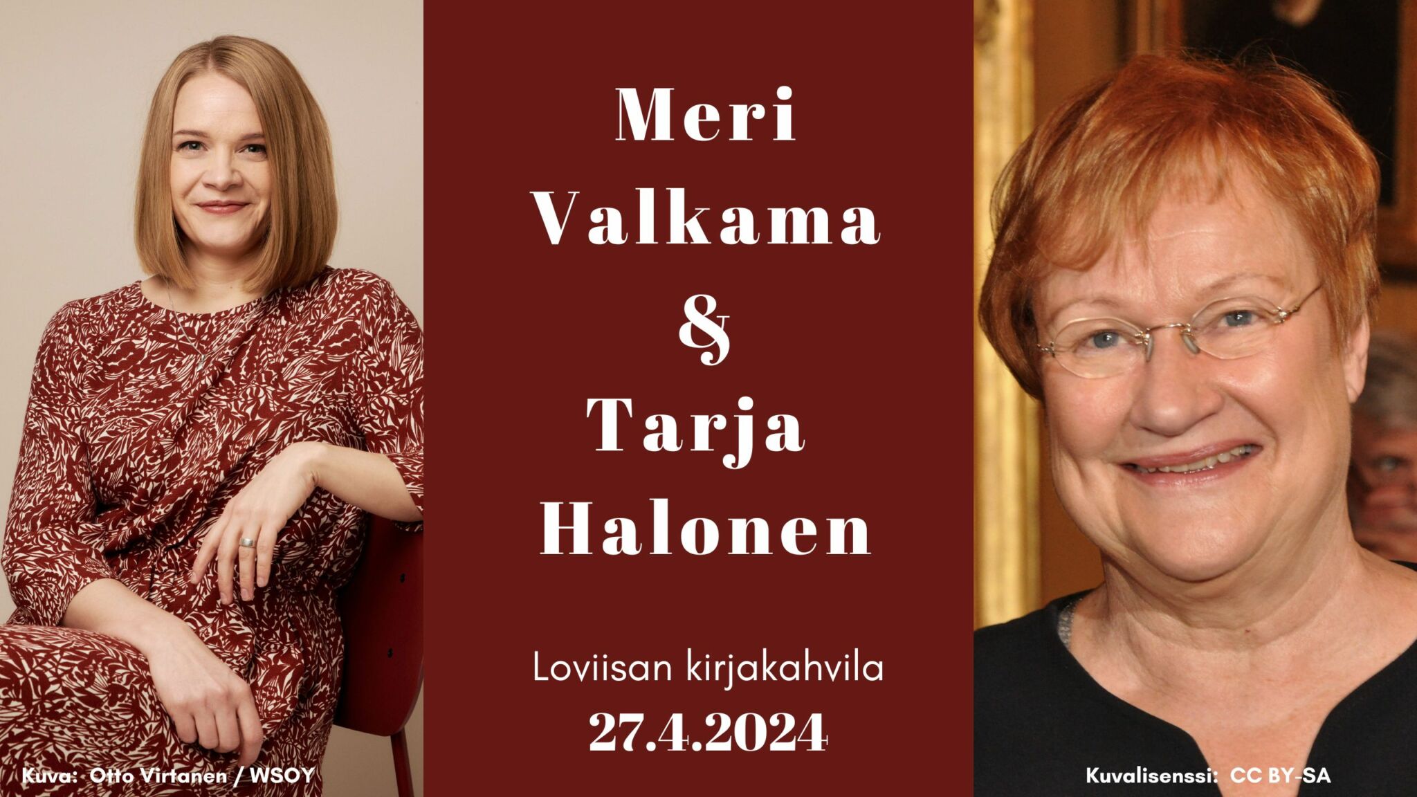 18.04.2024 Lovisa bokcafé 27.4.2024: Meri Valkama och Tarja Halonen Författaren Meri Valkama och president Tarja Halonen berättar om Valkamas bok ”Perinnönjako: keskusteluja Tarja Halosen politiikasta” på Lovisa bokcafé i Kino Marilyn 27.4.2024 kl. 13-14. Som intervjuare fungerar Sari Rahkonen och Runo Kuu. Tillfället är finskspråkigt, men boken finns översatt till svenska med titeln ”Arvet: samtal om Tarja Halonens politik”. Välkommen! Bokcaféet kommer att streamas på Facebook på Lovisa biblioteks sida ”Loviisan kirjastot Lovisa bibliotek”. Videoinspelningen kan ses i efterhand på YouTubekanalen ”Lovisa bokcafé”. Dela: Länken har kopierats till urklipp