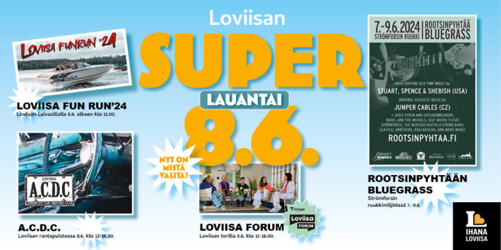 06.06.2024 Upplev en superlördag med evenemang i Lovisa 8.6.2024 I Lovisa firas en lördag fullspäckad av evenemang 8.6.2024. Rootsinpyhtää Bluegrass i Strömfors bruk Finlands äldsta – redan 36 år gamla – festival med traditionell amerikansk musik Rootsinpyhtää Bluegrass ordnas 7–9.6.2024 i Strömfors bruk. Lördag 8.6 från och med klockan 12 ordnas en trevlig utomhuskonsert för hela familjen på Stallbacken. Huvudartister är det amerikanska bandet Stuart, Spence & Shebish och det tjeckiska bandet The Jumper Cables. Evenemanget arrangeras av föreningen Suomen Bluegrass-musiikin Yhdistys ry. På lördag 8.6 klockan 13–17 finns det också möjlighet att bekanta sig med Classic Old Western Societys läger för återskapare av amerikansk historia. Till alla barns glädje gästar djurgården Kiertävä Farmi från Pyttis Stallbacken på lördag klockan 12–16. Hela veckoslutets program finns att läsa på finska på evenemangets webbplats. Loviisa Fun Run och ACDC Picnic på Skeppsbron Det nya motorbåtsevenemanget Loviisa Fun Run ordnas lördag 8.6.2024 i Lovisa gästbåtshamn. Båtmotorerna startas prick klockan 12 och starten sker genast efter det. Därför välkomnas åskådarna till platsen redan klockan 11. Rutten går längs officiella farleder via Kabböle till Pellinge. Rutten tillbaka går längs yttre farleder till Orrengrund och därifrån till Skeppsbron, där ankomsten beräknas ske cirka klockan 16. En mer detaljerad ruttplan och mer information finns på Loviisa Fun Runs Facebooksidor. I Skeppsbroområdet finns det program för barn och vuxna hela lördagen. American Car Drivers Club Loviisas meeting för amerikanska bilar (ACDC Picnic) ordnas i Strandparken vid Skeppsbron lördag 8.6 klockan 12–16.30. Föreningen ACDC Loviisa Ry:s Facebooksidor Loviisa Forum och allsång på Lovisa torg Loviisa Forum är ett diskussions- och kulturevenemang som Lovisa Företagare arrangerar på Lovisa torg lördag 8.6.2024 klockan 11–15. På programmet står intressanta diskussioner och intervjuer samt kultur- och musikföreställningar. Evenemanget är ett öppet utomhusevenemang som är riktat såväl till invånare och företag som till turister. Bekanta dig med programmet på Loviisa Forum (på finska) Loviisa Forum-dagen avslutas med allsång på Lovisa torg klockan 15–16. Allsången leds av musikern Kalle Katz, och ordföranden för Lovisa Företagare Andreas Ögård är evenemangsvärd. Kom med och sjung finsk- och svenskspråkiga sånger i det glada gänget! Öppna byar Den nationella Öppna byar-dagen ordnas redan för tionde gången 8.6.2024. Fyra byar i Lovisa deltar i evenemanget. Köpbacka Ett avgiftsfritt informations- och diskussionsmöte om beredskap hemma för 72 timmar 8.6 klockan 14–17. Evenemanget är öppet för alla. Leds av Kirsi Kippola. Arrangör: Köpbacka byaförening. Adress: Varfsvägen 2, Lovisa Mer information: kopbacka.fi Pitkäpää Öppna Byar-evenemang 8.6 klockan 12–15 på byastranden i Pitkäpää. Sommarkaféet Pippiboden öppet. Adress: Pitkäpäävägen 313, Pernå Mer information Sarvsalö Sommarens första sommartorg 8.6 klockan 10–12. Kontroll av brandsläckare. Dragspelsmusik på torgkaféet. Adress: Sarvsalövägen 1035, Härpe Mer information: sarfsalo.fi Valkom Valkom byaförening ordnar lördag 8.6 klockan 11–15 ett evenemang om Valkoms historia i ord och bild i allaktivitetshusets bibliotek. Välkommen med för att diskutera gamla minnen och lära dig mer om Valkomområdets historia och utveckling. Kaffeservering. Adress: Valkom allaktivitetshus, Långängsvägen 62, Valkom Mer information Dela: Länken har kopierats till urklipp