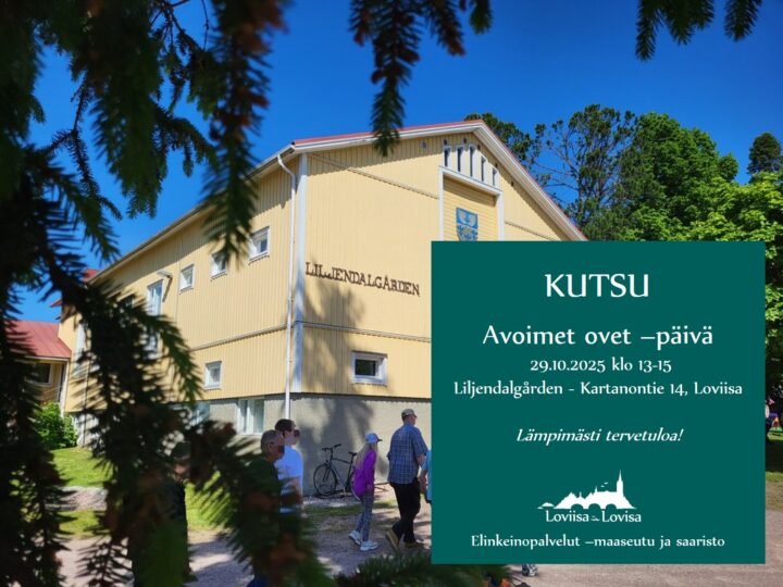 23.09.2025 KUTSU: Avoimet ovet -päivä, Liljendalgården 29.10.2025 klo 13–15 – Tervetuloa! Loviisan Maaseutu on mahdollisuus -kampanja huipentuu maaseutu- ja saaristoyksikön avoimien ovien päivään, joka järjestetään ke 29.10.2025 klo 13–15 Liljendalgårdenissa. Tapahtumassa yleisöllä on ainutlaatuinen tilaisuus tutustua Loviisan elinkeinokehittäjien verkostoon sekä kaupungin maaseutu- ja saaristoyksikön toimintaan. Maaseutu on mahdollisuus -kampanja nostaa esiin maaseudun vahvuudet: ilmastoviisaat turvepeltojen ratkaisut, älymaatalouden ja satelliittidatan, kestävän ruoantuotannon käytännöt, luonnon monimuotoisuuden turvaamisen sekä nuorten viljelijöiden tärkeän roolin tulevaisuuden tekijöinä. Kampanjan voima yhdistää tutkimustiedon, viljelijöiden kokemukset ja konkreettiset esimerkit. Se tekee monimutkaisista asioista ymmärrettävämpiä ja nostaa paikalliset teot osaksi valtakunnallista ja kansainvälistä keskustelua. Näin Loviisa profiloituu suunnannäyttäjänä rakentaen maaseudusta ja saaristosta elinvoimaista, kestävää ja houkuttelevaa – nyt ja tulevaisuudessa. Ohjelma Loviisan kaupunginjohtaja Tomas Björkroth esittelee organisaatiomuutoksen tuomia mahdollisuuksia elinkeinopalveluiden näkökulmasta painopisteenä maaseutu ja saaristo. Katri Roivainen (elinvoimakehittäjä, Loviisan kaupunki) kertoo kaupungin roolista elinkeinopalveluissa. Sami Perttula (yritysasiantuntija, Cursor Oy) esittelee aloittaville ja toimiville yrittäjille Cursorin palveluita ja Cursor Matkailua. Gina Forsström (hankeneuvoja, Silmu ry) kertoo ajankohtaisista rahoitusmahdollisuuksista. Tilaisuuden aikana on tarjolla kahvia ja pullaa, ja vapaamuotoisessa osuudessa on mahdollista keskustella asiantuntijoiden kanssa sekä verkostoitua muiden osallistujien kanssa. Tule kuulemaan, näkemään ja inspiroitumaan maaseudun ja saariston monipuolisista mahdollisuuksista. Aika: keskiviikko 29.10.2025 klo 13–15Paikka: Liljendalgården, Kartanontie 14, 07880 Loviisa Lämpimästi tervetuloa Loviisan kaupunkiElinkeinopalvelut-maaseutu ja saaristo Jaa: Linkki kopioitu leikepöydälle
