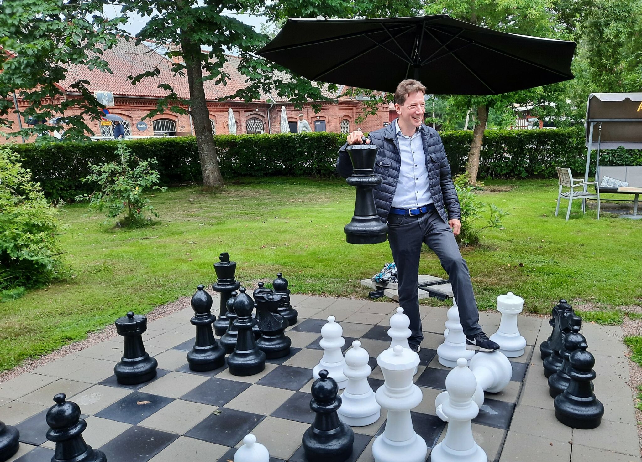 kaupunginjohtaja esittelee isoa shakkinappulaa