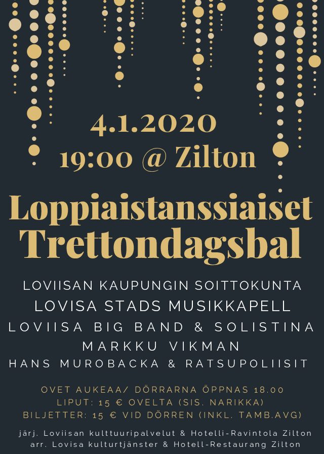 02.01.2020 Loppiaistanssiaiset Perinteiset loppiaistanssiaiset uudistuneessa Ziltonissa! Tanssittamassa:* Loviisan kaupungin soittokunta ** Loviisa Big Band solistina Markku Vikman ** Hans Murobacka & Ratsupoliisit * Ovet aukeavat klo 18. Lipu 15€ sis. narikka. Lipunmyynti ovella. Järj. Loviisan kulttuuripalvelut & Hotelli-Ravintola Zilton Jaa: Linkki kopioitu leikepöydälle