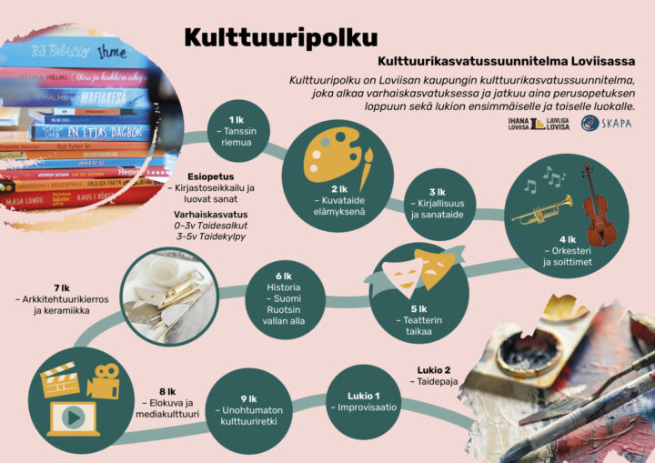 12.11.2025 Loviisa ottaa käyttöön Kulttuuripolku 2.0:n – taide ja kulttuuri luontaiseksi osaksi oppimista Loviisan kaupunki ottaa uuden askeleen pitkäjänteisessä kulttuurikasvatustyössään. Ottamalla käyttöön Kulttuuripolku 2.0:n kaupunki kehittää suunnitelmaansa kulttuuri- ja taidekasvatuksesta varhaiskasvatuksessa, esikoulussa, koulussa ja lukiossa. Päivitetty malli pohjautuu kolmevuotisessa strategisessa SKAPA-hankkeessa saatuihin kokemuksiin. Hanke toteutettiin Svenska kulturfondenin tukemana. – SKAPA on ollut ihana hanke, joka on antanut meille rohkeutta, rakennetta ja innoitusta jatkaa eteenpäin. Olemme saaneet mahdollisuuden tehdä yhteistyötä ammattimaisten taidepedagogien kanssa ja kehittää uusia työtapoja niin koulussa kuin varhaiskasvatuksessakin, sanoo Johanna M. Lönnfors, Loviisan kaupungin kulttuurikylpykoordinaattori. Taideopetus vahvistaa lasten ja nuorten itsetuntoa, hyvinvointia, empatiaa, identiteettiä, itseilmaisua ja luovuutta. On tärkeää, että tämä on näkyvä osa kaikkien lasten ja nuorten opetussuunnitelmaa. Pikkulapsesta lukiolaiseen – kulttuuria koko koulupolun ajan Kulttuuripolku 2.0 varmistaa, että kaikki loviisalaiset lapset ja nuoret – varhaiskasvatuksesta lukioon – saavat kohdata taidetta, kulttuuria ja kulttuuriperintöä kouluaikansa jokaisena vuotena. Teatterista, tanssista, sanataiteesta ja kuvataiteesta on tullut luonteva osa arkea varhaiskasvatuksessa. – On erityisen tärkeää, että taideaineista on tullut jotain arjessa tapahtuvaa, eikä vain yksittäisissä hankkeissa. Lapset ilmaisevat itseään, luovat ja kokevat useiden aistien välityksellä, kertoo Sofia Hoff, Loviisan kaupungin varhaiskasvatuspäällikkö. Perusopetuksessa kulttuurisisältö etenee selkeästi vuodesta vuoteen – esimerkiksi tanssi ensimmäisellä luokalla, kuvataide toisella luokalla, kirjallisuus ja kerronta kolmannella luokalla, musiikki neljännellä luokalla ja näyttämötaide viidennellä luokalla sekä historia, arkkitehtuuri ja elokuva korkeammilla vuosiluokilla. Nyt myös lukio sisältyy suunnitelmaan, jossa opiskelijat muun muassa saavat kohdata luovuutta ja ilmaisukykyä vahvistavaa improvisaatioteatteria. Musiikkityöpaja erityistarpeisille lapsille – esteettömyyden ja yhdenvertaisuuden takia Uusi ja tärkeä osa Kulttuuripolku 2.0:a on musiikkityöpaja erityistarpeisille lapsille. Loviisan kaupunki haluaa suunnatuin kulttuuripanostuksin varmistaa, että kaikki lapset saavat mahdollisuuden osallistua ja ilmaista itseään taiteen ja musiikin kautta, edellytyksistä riippumatta. – Tämä on tärkeä askel esteettömyydelle ja yhdenvertaisuudelle. Kaikilla lapsilla tulee olla oikeus ilmaista itseään ja kokea luovuuden iloa omalla tavallaan, sanoo Lotta Juslin, Generalshagens skolan rehtori. Ammattimaisia kulttuuripedagogeja yhteistyössä koulujen kanssa Tärkeä piirre Kulttuuripolku 2.0:ssa on syvennetty yhteistyö ammattimaisten kulttuuripedagogien ja kaupungin opettajien välillä. Taiteilijoita ja pedagogeja useilta aloilta – musiikista, tanssista, teatterista, sanataiteesta, elokuvasta ja kuvataiteesta – tekee yhteistyötä koulujen ja esikoulujen kanssa opetusta tukevien kulttuurikokemusten suunnittelussa ja toteutuksessa. – Tämä yhteistyö on korvaamattoman arvokasta. Opettajat saavat uusia työtapoja, taiteilijat kohtaavat lapsia ja nuoria arjessa ja lapset saavat kokea kulttuuria aidosti – eikä vain lukea siitä, sanoo Auli Saarinen, Loviisan kaupungin koulutuspäällikkö. Loviisan elinvoimaa vahvistava suunnitelma – Kulttuuripolku 2.0 sopii täydellisesti yhteen Loviisan kaupungin tunnustukseen Lapsiystävällisenä kuntana (Unicef). Se velvoittaa meitä jatkamaan toiminnan kehittämistä lasten paras keskipisteessä, sanoo Kirsi Kinnunen, Loviisan kaupungin sivistysjohtaja. – Panostus kulttuuriin ja osallistamiseen lisää kaupungin elinvoimaa ja tekee Loviisasta vielä vetovoimaisemman kotikaupungin niin nykyisille kuin uusillekin perheille. Suunnitelma tulevaisuudelle Kulttuuripolku 2.0 rakentuu aiemmalle kulttuuri- ja taidekasvatussuunnitelmalle, mutta kehittää sitä edelleen nykypäivän tarpeita vastaavaksi. Tavoite on, että kaikki lapset ja nuoret saavat yhdenvertaisen mahdollisuuden taiteeseen ja kulttuuriin – ja että kulttuuriperinnöstä tulisi elävä osa opetusta Loviisassa. Suunnitelma on saatavilla linkin Kulttuurikasvatus Loviisassa – Kulttuuripolku takaa, ja se integroidaan asteittain kaupungin kaikkiin kouluihin ja varhaiskasvatuksen yksiköihin. Jaa: Linkki kopioitu leikepöydälle