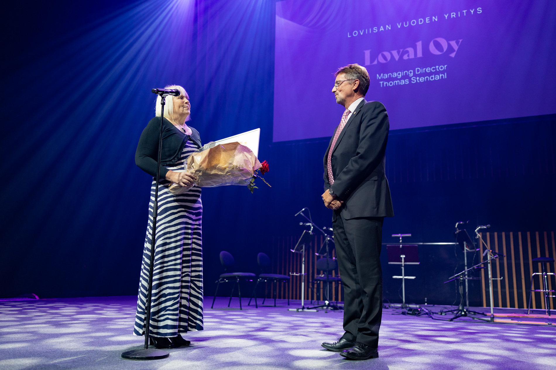 06.09.2023 Loviisalaisyrittäjiä ja yrityksiä palkittiin Yrittäjägaalassa Loval Oy ja Hilding Business Park palkittiin Cursor Oy:n ensimmäisessä Yrittäjägaalaassa. Cursor Oy tarjoaa elinkeinopalveluja Loviisassa ja Kotkan-Haminan seudulla. Gaala järjestettiin Yrittäjän päivänä 5.9.2023 Kotkan Satama Areenassa. Tapahtuma kokosi yhteen noin 500 alueen yrittäjää, yrittäjäyhdistysten ja kuntien edustajaa sekä muita juhlavieraita. Kunnat ja yrittäjäjärjestöt jakoivat gaalassa Vuoden yrittäjä -palkintoja ja palkitsivat myös yrittäjiä ja yrityksiä, jotka ovat tehneet poikkeuksellista työtä yritystensä ja yhteisöjensä hyväksi. Loviisan kaupunki ja Loviisan Yrittäjät ry palkitsivat Loval Oy:n vuoden yrityksenä. Loval Oy:n Managing Director on Thomas Stendahl. Kunniamaininnan yrittäjyydestä saivat puolestaan Hilding Business Parkin perustajat Ken ja Dani Ryynänen. Kuva: Cursor Oy / Jukka Koskinen Jaa: Linkki kopioitu leikepöydälle