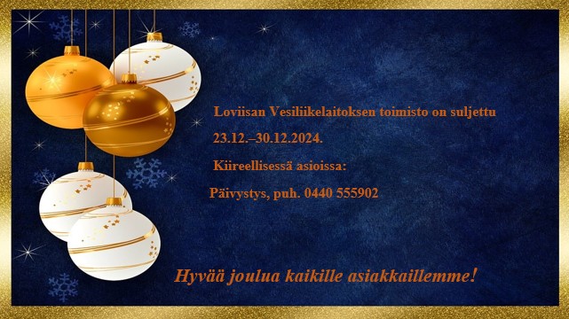 20.12.2024 Loviisan Vesiliikelaitos tiedottaa: Toimisto on suljettu 23.–30.12.2024 Kiireellisissä asioissa ota yhteys Loviisan vesiliikelaitoksen päivystykseen puh. 0440 555 902. Jaa: Linkki kopioitu leikepöydälle