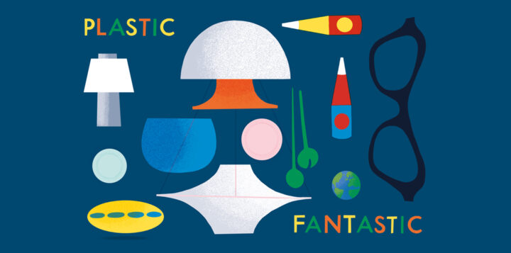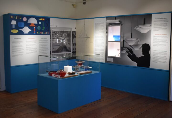 Näyttelyssä käsitellään muovin historiaa sekä suomalaista muotoilua.