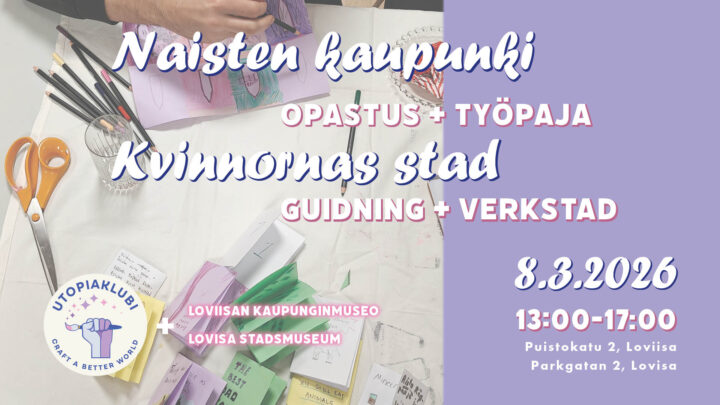 27.02.2026 Naistenpäivänä historia ja luovuus yhdistyvät Loviisan kaupunginmuseolla Kansainvälistä naistenpäivää vietetään Loviisan kaupunginmuseolla opastuksen ja työpajan merkeissä sunnuntaina 8.3.2026 kello 13–17. Ohjelmasta vastaavat kaupunginmuseo ja Utopiaklubi. Kurkistus Loviisan tunnettuihin ja tuntemattomiin naisiin Päivä alkaa museolla “Naisten kaupunki” -opastuksella. Museointendentti Ulrika Rosendahlin johdolla näkyville nousevat niin tunnetut kuin tuntemattomammatkin naiset Loviisan historiasta ja museon näyttelystä. Opastukset järjestetään kello 13 ruotsiksi ja kello 14 suomeksi. Kansainvälisen naistenpäivän kunniaksi museoon, opastuksiin sekä työpajaan on ilmainen sisäänpääsy. Naistenpäivän opastuksessa näkyville nousevat niin tunnetut kuin tuntemattomammatkin naiset Loviisan historiasta ja museon näyttelystä. Ollaan yhdessä, luodaan yhdessä Kaupunginmuseo yhdistää voimansa loviisalaisen Utopiaklubin kanssa, ja naistenpäivä museolla täydentyy kello 14.30-17.00 Utopiakubin työpajalla, jossa luodaan yhteinen zine. Zine (/zi:n/) on itsetehty lehtinen, joka käsittelee tekijälleen merkittävää sisältöä erilaisten ilmaisumuotojen kautta, kuten tekstien, kuvien, taiteen ja runouden avulla. Utopiaklubin työpajoille tyypillisesti on luovuutta ruokkimassa pientä tarjoilua. Työpajassa valmistuneet sivut kootaan yhteen yhdeksi kokonaisuudeksi – Loviisan omaksi zineksi. Utopiaklubin zine-työpajassa luodaan yhdessä naisten päivän zine. Kuva: Utopiaklubi. Teemana naiset ja naistenpäivä Inspiraatiota naistenpäivän työpajaan tuovat museon opastus, näyttelytilat sekä työpajaa varten esillä oleva materiaali. Halukkaat voivat myös hyödyntää museon Finna-sivuilta löytyviä digitoituja valokuvia. Työpajassa voidaan syventyä pohtimaan miten unelmien naistenpäivää juhlitaan, mikä on muuttunut naisten asemassa omana elinaikana, tai millaisena naisten ja tyttöjen tulevaisuuden haluaisi näyttäytyvän. Oma zine-sivusi voi olla kirje elämässäsi tärkeälle naiselle, oli se sitten historiallinen henkilö, fiktiivinen hahmo tai itsellesi läheinen henkilö. Tee kollaasi, kirjoita runo, piirrä tai tee näitä kaikkia omaan zineesi. Tyyli on vapaa. Naistenpäivän ohjelma Loviisan kaupunginmuseolla 8.3.2026: Klo 12:00 Museo avaa ovensa Klo 13:00 Naisten kaupunki – opastus ruotsiksi Klo 14:00 Naisten kaupunki – opastus suomeksi Klo 14.30 Utopiaklubin zine työpaja – luodaan yhdessä naistenpäivän zine Klo 17:00 Tapahtuma päättyy Tervetuloa! Lisätietoa: museoamanuenssi Elina Parkkila puh. 040 866 8579 Loviisan kaupunginmuseo, Komendantintalo Puistokatu 2, 07900 Loviisa Jaa: Linkki kopioitu leikepöydälle