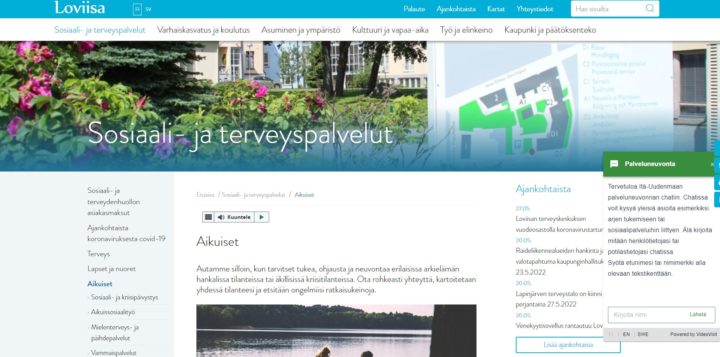 30.05.2022 Nyt saat sosiaalineuvontaa myös chatin kautta Itä-Uudenmaan kuntien verkkosivuilta Itä-Uudenmaan kunnat täydentävät sosiaalineuvontaansa ottamalla käyttöön uuden chat-palvelun. Sosiaalipalveluiden neuvonta-chat toimii jo Askolan, Lapinjärven, Loviisan ja Sipoon verkkosivustoilla, ja se on tarkoitettu näiden kuntien asukkaille. Palvelu laajenee Porvooseen myöhemmin kesällä. Sosiaalipalveluiden neuvonta-chat auttaa lasten, perheiden, työikäisten, ikääntyneiden ja vammaisten sosiaalipalveluihin ja päihde- ja mielenterveyspalveluihin liittyvissä kysymyksissä. Neuvonta-chat ja tarvittaessa asiakasneuvoja vastaavat kysymyksiin esimerkiksi erilaisista tukipalveluista sekä etuuksien ja tukien hakemisesta. Chat-palvelu toimii kuntien sosiaalipalveluiden verkkosivuilla. Sitä voi käyttää myös mobiililaitteella. Chatbot vastaa asiakkaiden kysymyksiin suomeksi ja ruotsiksi 24 tuntia vuorokaudessa, vuoden jokaisena päivänä. Asiakasneuvoja on tavoitettavissa maanantaisin kello 12–16 ja tiistaista torstaihin kello 9–11 ja 12–14. – Chat-palvelusta on helppo hakea neuvoja vaikka kotoa käsin ja juuri silloin kuin itselle sopii. Näin asiakas pystyy hallitsemaan itse omaa tilannettaan ja hakemaan apua joustavasti. Uusien, digitaalisen palvelujen kehittäminen tähtää samalla sote-palvelujen toimintatapojen kehittämiseen ja yhtenäistämiseen Itä-Uudenmaan hyvinvointialueella niin, että palvelut ovat kaikkien saavutettavissa. Näin myös toiminnan tuottavuus ja vaikuttavuus paranevat, sanoo kuntien yhteisten sote-uudistushankkeiden hankejohtaja Jaana Forslund. Jaa: Linkki kopioitu leikepöydälle