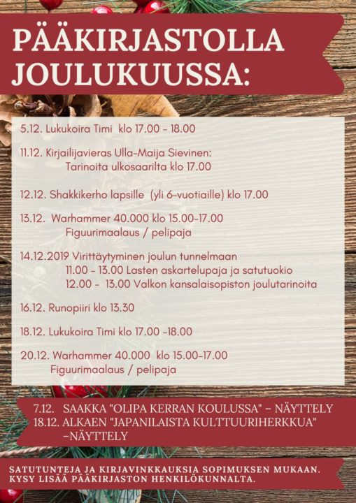 28.11.2019 Pääkirjaston tapahtumat joulukuussa 5.12. klo 17.00 -18.00 Lukukoira Timi KAKSIKIELINEN 11.12. klo 17.00 Kirjailijavieras Ulla-Maija Sievinen: Tarinoita ulkosaarilta SUOMENKIELINEN 12.12. klo 17.00 Shakkikerho (yli 6-vuotiaille) KAKSIKIELINEN 13.12. klo 15.00-17.00 00 Warhammer 40.000 figuurimaalaus / pelipaja KAKSIKIELINEN 14.12. Virittäytyminen joulun tunnelmaan. Tarjolla glögiä, mehua ja pientä purtavaa. 11.00 – 13.00 Lasten askartelupaja ja satutuokio KAKSIKIELINEN 12.00 – 13.00 Valkon kansalaisopiston, Loviisan kirjoittajaryhmäläiset lukevat tarinoitaan ”Syksystä Jouluun” –teemalla SUOMENKIELINEN 16.12. klo 13.30 Runopiiri, SUOMENKIELINEN 18.12. klo 17.00 -18.00 Lukukoira Timi KAKSIKIELINEN 20.12. klo 15.00-17.00 Warhammer 40.000 figuurimaalaus / pelipaja KAKSIKIELINEN 7.12.2019 saakka Olipa kerran koulussa – näyttely 18.12.2019-27.2.2020 Japanilaista kulttuuriherkkua –näyttely Satutunteja ja kirjavinkkauksia sopimuksen mukaan. Kysy lisää pääkirjaston henkilökunnalta. Jaa: Linkki kopioitu leikepöydälle