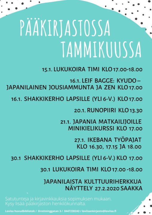 20.12.2019 Pääkirjaston tapahtumat tammikuussa 15.1. klo 17.00 -18.00 Lukukoira Timi 16.1. klo 17.00 Leif Bagge: Kyudo – japanilainen jousiammunta ja Zen 16.1 klo 17.00 Shakkikerho lapsille (yli 6-vuotiaille) 20.1. klo 13.30 Runopiiri 21.1. klo 17.00 Japania matkailijoille minikielikurssi 27.1. Ikebana työpajat – klo 16.30, 17.15 ja 18.00 30.1. klo 17.00 Shakkikerho lapsille (yli 6-vuotiaille) 30.1. klo 17.00 -18.00 Lukukoira Timi Japanilaista kulttuuriherkkua –näyttely 27.2.2020 saakka. Satutunteja ja kirjavinkkauksia sopimuksen mukaan. Kysy lisää pääkirjaston henkilökunnalta. Jaa: Linkki kopioitu leikepöydälle