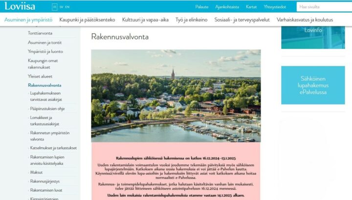 11.12.2024 Rakennuslupien sähköisessä hakemisessa katkos 16.12.2024–13.1.2025 Rakennuslupien sähköisessä hakemisessa on katkos ajalla 16.12.2024–13.1.2025. Katkos johtuu uuden rakentamislain voimaantulosta ja sen vaatimien uudistusten ja sähköisen lupajärjestelmän päivityksestä. Uusi rakentamislaki astuu voimaan 1.1.2025 ja tuo muutoksia muun muassa rakennusvalvonnan prosesseihin, lomakkeisiin, asiakirjoihin ja ohjelmistoihin. Kaikki 16.12.2024 mennessä jätetyt hakemukset käsitellään nykyisen maankäyttö- ja rakennuslain perusteella. Vaikka päätös tehtäisiin vuoden 2025 puolella, lupahakemuksista veloitetaan tämänhetkisen taksan mukaan. Katkon jälkeen jätetyt hakemukset käsitellään uuden rakentamislain mukaan, ja lupapäätöksistä peritään uudistetun taksan mukaisesti. Pahoittelemme tästä mahdollisesti aiheutuvaa haittaa. Ystävällisin terveisin, Loviisan kaupunkiElinkeino- ja infrastruktuurikeskus Jaa: Linkki kopioitu leikepöydälle