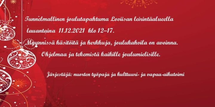 26.11.2021 Tunnelmallinen joulutapahtuma Loviisa Campingillä lauantaina 11.12.2021 kello 12–17 Loviisa Campingin leirintäalueella osoitteessa Kapteenintie 1 järjestetään tunnelmallinen joulutapahtuma lauantaina 11.12.2021 kello 12–17. Myynnissä on käsityötuotteita ja herkkuja, ja lisäksi joulukahvila on avoinna. Luvassa on ohjelmaa ja tekemistä kaikille joulumielisille. Tervetuloa nauttimaan joulun tunnelmasta koko perheen voimalla. Tule kahvilaan juomaan ystävien kanssa lämpöiset glögit, syömään koko perheen kanssa maukasta joulupuuroa tai vaikka täyttämään makeanhimo joulutortuilla. Kaikille löytyy tekemistä, muun muassa askartelua, tonttupolku sekä joulusatu ja ehkäpä yllätys tai toinenkin on luvassa. Käperry ulkotulien ja nuotion eteen paistamaan makkaraa tai vaikkapa vaahtokarkkeja samalla, kun nautit alueen joulukoristeista ja miniatyyritonttukylästä. Nuotiolle voi ottaa omat grilliherkut mukaan tai makkarat voi ostaa kahviosta ja grillata itse. Alueelta löydät myös erilaisia valokuvauskohteita, joissa voit ottaa jouluvalokuvan vaikka koko suvusta tai kaverikuvan ”selfiekuva Loviisassa” -taustan kanssa. Kaikkien kävijöiden kesken arvomme kaksi kappaletta kahden hengen yhden yön yöpymistä ensi kesäkaudelle Loviisa Campingille. Voittajat saavat valita, missä majoituksessa haluavat alueella yöpyä. Ohjelma kello 12 Tapahtuman avaus kello 12–15 Jouluaskartelua kello 12–17 Tonttupolku lapsille ja lapsenmielisille kello 13 Joulusatu ”Tonttu ja unohtunut joulupaketti” (suomeksi) kello 13–15 Joulupukin muori tanssittaa ja laulattaa lapsia ja lapsenmielisiä kello 14 Joulusatu ”Tomten och den bortglömda julklappen” (ruotsiksi) kello 15 Joulusatu ”Tonttu ja unohtunut joulupaketti” (suomeksi) kello 16 Joulusatu ”Tomten och den bortglömda julklappen” (ruotsiksi) kello 12–17 Tikkupullan paistamista avotulella KP Koirapalvelun koiravaljakkoajeluja kärryillä, 10 euroa kierros Alueelle on myös mahdollista tulla myymään käsitöitä ja herkkuja. Paikkamaksu on 10 euroa. Ota oma pöytä mukaan. Varaa paikkasi numerosta 040 578 9539. Nähdään siellä! Järjestäjä: Loviisan kaupungin nuorten työpaja ja kulttuuri- ja vapaa-aikatoimi Jaa: Linkki kopioitu leikepöydälle