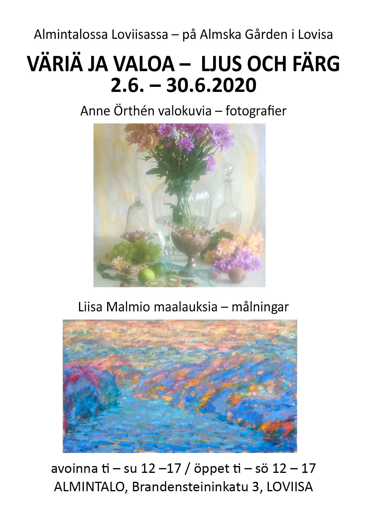 24.06.2020 Väriä ja valoa- näyttelyn viimeinen viikko! Väriä ja valoa- näyttelyyn viimeinen viikko Almintalossa. Näyttely päättyy 30.6.2020 Anne Örhénin ja Liisa Malmion yhteisnäyttely ”Väriä ja Valoa” on avoinna Almintalossa vielä 30.6. saakka. ”Valokuvateokseni asetelmista kertovat menneestä ajasta, kukkien kauneudesta, jostain kadotetusta ja arvoituksellisuudesta. Kauniit vanhat esineet, muodot, värit ja kukat ovat olleet minulle inspiraation lähde.” Anne Örthén ”Olen ennen kaikkea luonnon kuvaaja keskittyen niin maalauksissani kuin valokuvissa kunkin hetken valon ja tunnelman taltioimiseen. Paljon olen maalannut ulkona luonnossa. Suomen kaunis saaristo on suurin innoittajani.” Liisa Malmio Jaa: Linkki kopioitu leikepöydälle