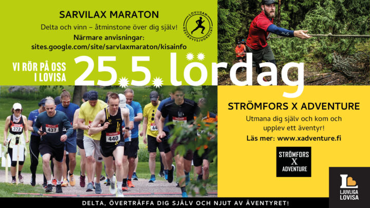 21.5.2024 Motionera i härliga miljöer 25.5.2024! Sarvlax maraton startar från Fredsby och Strömfors X Adventure från Strömfors bruk. ? Sarvlax maraton Osallistu ikimuistoiseen tapahtumaan kulttuurimaisemassa! Ennakkoilmoittautuminen on suljettu, jälki-ilmoittautuminen paikan päällä klo 10 mennessä kisapäivänä. Delta i ett oförglömligt evenemang i kulturlandskap! Förhandsanmälan är avslutat, men du kan anmäla dig i efterskott på plats innan klockan 10 på tävlingsdagen. läs mer ? Strömfors X Adventure I Strömfors X Adventure rör du dig genom att paddla, cykla, gå och kanske till och med bada. Det finns många olika utmaningar och uppdrag längs vägen. Serier för både nybörjare och erfarna äventyrare. Läs mer och anmäl dig Dela: Länken har kopierats till urklipp