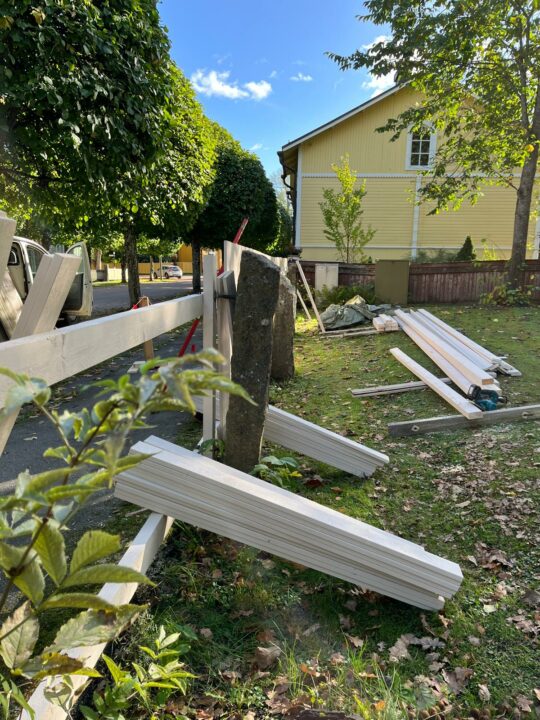 Lokakuun terveiset Lovmista eli Loviisan kansalaisopistolta! Opistotalon pihassa aitaa kaatuu ja tanner tömisee, kun lauta-aita korjataan entiselleen. Sadepäivät ovat hidastaneet taitavan timpurimme työtä, mutta silti valmista aitaa ilmestyy näkyviin metri metriltä.