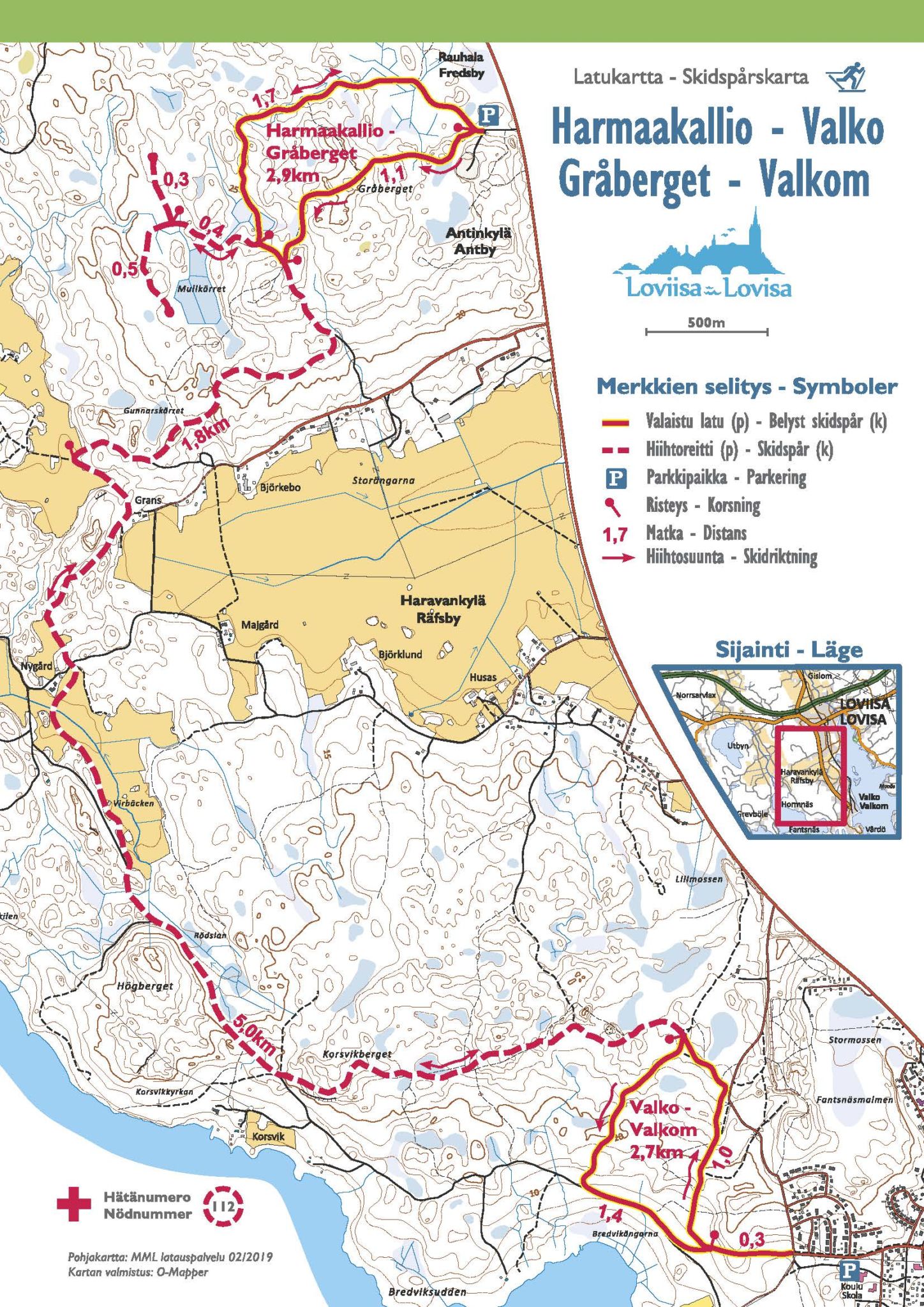 I Gråberg 3 km (delvis belyst). Det anslutande spåret till Valkom är för närvarande ur bruk. Vägskälet till Gråberg finns vid Valkomvägen ca 250 meter från Valkomvägens och Helsingforsvägens korsning.
