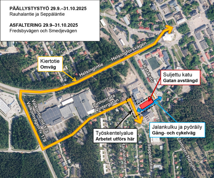 25.09.2025 Asfaltsarbeten börjar på Fredsbyvägen och Smedjevägen 29.9.2025 – bringar undantag till vardagen På Fredsbyvägen och Smedjevägen görs asfaltbeläggningsarbeten i närheten av det nya daghemmet under september–oktober. Beläggningsarbetena medför avvikande trafikarrangemang på området. På Smedjevägen genomförs asfaltarbetena så att minst en körfil är i användning. Fredsbyvägen stängs helt för personbilstrafik under arbetet, endast bussar och räddningsfordon tillåts. Förbifartsväg: Under asfaltarbetena ordnas det för fordon en förbifartsväg via Vintergatan och Helsingforsvägen. För fotgängare och cyklister ordnas passage genom bygget. Arbetena inleds 29.9.2025 och de uppskattas vara i fyra veckor. Vi beklagar den eventuella olägenhet arbetet förorsakar på vardagen. Lovisa stad Dela: Länken har kopierats till urklipp