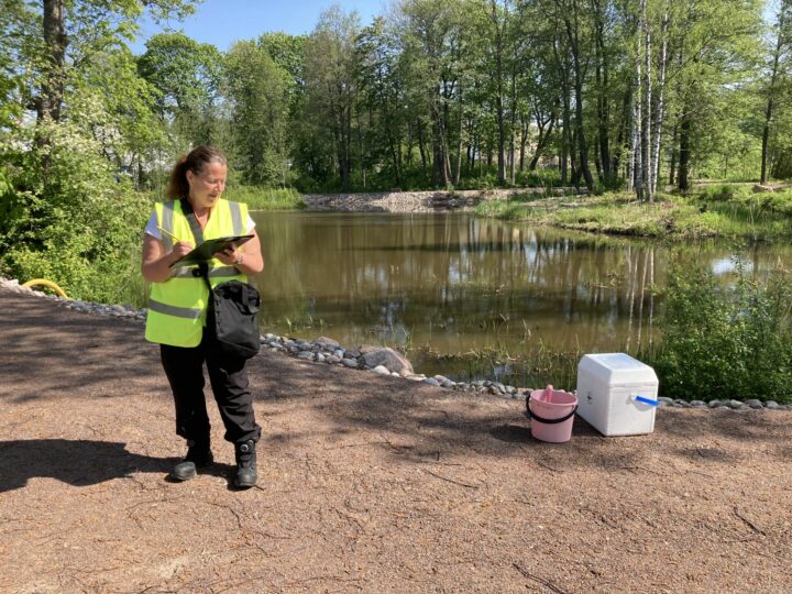 14.12.2023 Dagvattendammar har en positiv inverkan på vattenkvaliteten Kronostranden, det ekologiska parkområdet i norra delen av Drottningstranden, är byggd med så hållbara principer som möjligt och på naturens och vattenhushållningens villkor. Områdets betydande träd och övrig växtlighet bevarades så långt som möjligt, och i byggandet utnyttjades jordmassor och stenar som redan fanns på området. Parkens fågeldammar är en del av naturens mångfald, men samtidigt fungerar de också som dagvattendammar och sålunda som förbättrare av vattenkvaliteten. I byggd miljö avleds dagvattnet bort så effektivt och snabbt som möjligt. Vattnets flödesvägar har artificiellt förkortats via t.ex. diken och rör med den påföljd att den försnabbade avrinningen sköljer med sig fasta partiklar, näringsämnen och bakterier. Detta i sin tur förorsakar problem i vattendragen och naturen. Strukturer som fördröjer avrinningen, så som dagvattendammar, kan för sin del minska på olägenheterna som dagvattnet medför. Dagvattendammarna i Kronostranden är byggda genom att utnyttja vattenelementen som funnits på området. I dammarnas höjdnivå har havsvattenståndet beaktats så att det inkommande dagvattnet fördröjs i bassängerna tillräckligt länge och först sedan rinner ut i havet. Då hinner en del av de fasta substanserna och orenheterna sjunka till bassängens botten istället för att hamna direkt ut i havet. Dagvattendammarnas funktion undersöktes på sommaren Under sommaren undersöktes dagvattendammarnas funktion. Det togs vattenprover av det vatten som kommer till dammarna och från det vatten som rinner ut från dammarna. Som referens togs en tredje damm i naturlikt tillstånd från ett närbeläget parkområde. Vattenprover togs från sex provtagningsställen månatligen från april till september. Från vattenproverna analyserades fasta substanser, näringsämnen och bakterier samt utöver dessa gjordes en engångsanalys av järn, mangan och zink. Fördröjningen av vatten i bassängerna verkar enligt resultaten avlägsna så väl fasta substanser, näringsämnen som bakterier. I och med att vattenkvaliteten hittills endast undersökts under en tillväxtperiod är resultatet endast riktgivande men ändå positivt. Enskilda prover har en stor inverkan på resultaten och den tidsmässiga variationen är stor. På bilden miljövårdsinspektör Maija Lehtomäki antecknar i protokollet. Nyttan med dagvattendammar Dagvattendammarna bidrar stort till trivseln och naturens mångfald på området, och utöver det observerades en positiv inverkan i vattenkvaliteten. Bassängernas funktion är naturligt mest effektiv i mitten av tillväxtperioden, då också växtligheten i dammarna fungerar som upptagare av näringsämnen och för sin del rengör vattnet. Dessutom är bassängerna viktiga platser bland annat för fågelbeståndet, vilket för sin del kan inverka betydligt på vattnets bakteriemängder. Dagvattendammarnas vatten rinner ut i Lovisaviken, där vikens eget ”vassruggsreningsverk” ytterligare sköter om rengöring av dagvattnet. Havsvikarnas vassruggar och övrig växtlighet har alltså betydelse för vattenkvaliteten. På längre sikt är det allt skäl att satsa på upprätthållandet och servicen av dagvattenbassängerna i parken Kronostranden. Då fungerar de även i fortsättningen som dagvattenrenare, fågelbiotop och rogivande landskapselement till glädje för alla som besöker parken. Vikten av dagvattenbehandling framhävs i och med klimatförändringen I och med klimatförändringen verkar regniga perioder och störtregn bli vanligare. Under vintrarna binder strändernas och vattendragens växtlighet inte näringsämnen eller fasta substanser lika effektivt, och då sköljs allt mer orenheter i vattendragen. Allt mer uppmärksamhet bör alltså i framtiden fästas vid avledning, fördröjning och behandling av dagvatten. Lovisa stadMiljövård Dela: Länken har kopierats till urklipp