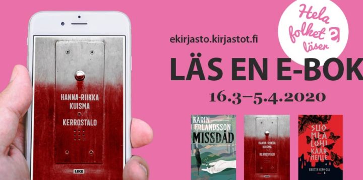 16.03.2020 Hela folket läser 16.3–5.4.2020 I mars är det igen dags att läsa e-böcker tillsammans med vänner, i klassen eller i en bokcirkel. Biblioteken och förlagen erbjuder en (finskspråkig) barn- och ungdomsbok, böcker för vuxna (en svensk- och en finskspråkig bok). Under hela tiden kampanjen Hela folket-läser pågår kan du fritt njuta av nedanstående böcker: Kuisma, Hanna-Riikka: Kerrostalo (Like) Erlandsson, Karina. Missdåd (Schildts & Söderströms) Hepo-oja, Briitta: Suomea lohikäärmeille (Otava) Kampanjböckerna hittar du den 16 mars i de allmänna bibliotekens gemensamma e-bibliotek på adressen http://ekirjasto.kirjastot.fi/sv. I e-biblioteket hittar du också annat att läsa, se på eller lyssna på. Kampanjböckerna kan du också läsa via ditt eget biblioteks sidor, på webbtjänsterna Ellibs eller Biblio eller med hjälp av Ellibs- och Biblio-apparna (som kan laddas till telefonen). Böckerna kan läsas på samma sätt som en vanlig webbsida eller laddas ner på en dator, pekplatta eller smarttelefon. Du behöver inte tänka på lånetider, för böckerna återlämnas automatiskt då utlåningstiden upphör Så här deltar du i kampanjen Hela folket läser För att låna böckerna behöver du bara ditt eget bibliotekskort från ditt lokala bibliotek, nätförbindelse och en apparat med vilken du kan läsa böckerna. Böckerna kan lånas samtidigt under hela kampanjtiden 16.3-5.4.2020. Dela: Länken har kopierats till urklipp
