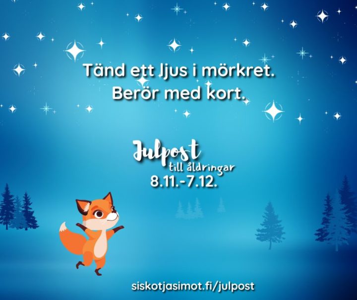 12.11.2021 Kampanjen Julpost till åldringar bjuder alla invånare i Lovisa att skicka julkort till åldringar Julens gladaste kortkampanj startar nu! Samfundet för kreativ omsorg, Siskot ja Simot ry, arrangerar tillsammans med sina samarbetspartner kampanjen Julpost till åldringar under tiden 8.11–7.12.2021 på mer än 90 orter samtidigt. Kampanjen samlar julkort till åldringar inom hemvård och serviceboende. I Lovisa samlas julkort till kunder inom hemvården och på vårdhem. – Genom att skicka ett julkort kan du få en ensam åldring att känna att någon har tänkt på just honom eller henne. Med ett kort kan du beröra och skapa glädje åt en medmänniska, säger Eero Väisänen, verksamhetsledare för Siskot ja Simot ry.– Hoppas Lovisaborna deltar lika ivrigt som ifjol, då vi samlade in sammanlagt hela 1 066 julkort, hoppas serviceansvarig Monica Sund från Lovisa stads seniortjänster. Som samarbetspartner för kampanjen fungerar Kommunförbundet, Medborgarinstitutens förbund, Medborgararenan och Finlands 4H-förening. Kampanjen beskyddas av republikens president Sauli Niinistö. Det är både enkelt och roligt att delta i kampanjen Man kan delta genom att göra ett julkort och hämta kortet till en av insamlingsplatserna under tiden 15.11.–7.12.2021. Så här gör du kortet: Skriv din julhälsning på kortet. Som mottagare skriver du ”Till Dig” och som avsändare ditt eget namn och Siskot ja Simot. Sätt kortet som sådant i insamlingslådan. Var vänlig och sätt inte kortet i ett slutet kuvert. I Lovisa är det också möjligt att göra kort i en julkortsverkstad. Julkortsverkstaden arrangeras i ungdomslokalen Forum, Brandensteinsgatan 13, fredag 26.11.2021 klockan 18–20 när det är öppet hus i Forum. Insamlingsplatserna i Lovisa: Kundservicekontoret LovinfoMariegatan 12 A, 07900 Lovisavardagar 9–16 SeniorservicenÖhmansgatan 4, 07900 Lovisavardagar 9–15 Kompanjonskapshuset HörnanÖhmansgatan 4, 07900 Lovisa I Lovisa är det också möjligt att skicka kort per post till Kundservicekontoret Lovinfo, PB 77, 07901 Lovisa. Skicka kortet i ett kuvert. Du kan också skicka flera kort i samma kuvert. Kom ihåg frimärket. Alla kortinsamlingsplatser och postadresser finns på kampanjens webbplats. Följ kampanjen på sociala medier: #berörmedkort #julpost #kosketakortilla #joulupostia Ytterligare information:Lovisa stad, serviceansvarig Monica Sund, monica.sund@loviisa.fi, tfn 0440 555 380Siskot ja Simot ry, verksamhetsledare Eero Väisänen, eero.vaisanen@siskotjasimot.fi / 050 545 31 45Siskot ja Simot ry, kampanjkoordinator Nonna Lemola-Palm, joulupostia@siskotjasimot.fi / 044 244 32 67 Dela: Länken har kopierats till urklipp