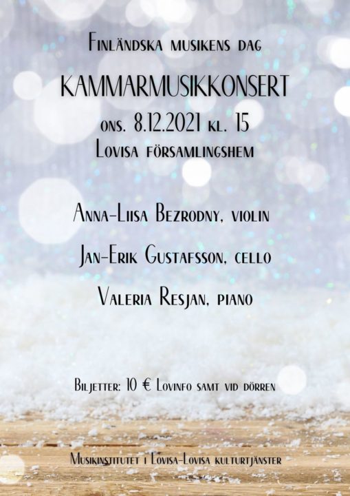 30.11.2021 Lovisa firar Sibeliusdagen, den finländska musikens dag Sibeliusdagen, den finländska musikens dag, firas 8.12.2021. I år kommer dagen att firas exceptionellt stort: på kvällskonserten ”Doften av nysnö” i Lovisa kyrka klockan 19 får vi höra Jean Sibelius Symfoni nr 6, Cecilia Damströms Tundo! och Jaakko Kuusistos Cellokonsert op. 38. På konserten spelar Lojo stadsorkester, som redan är bekant för Lovisaborna, ledd av Jukka Untamala. Solist i cellokonserten är Jan-Erik Gustafsson, som för närvarande är en av våra internationellt sett mest efterfrågade solister. Gustafsson var konstnärlig ledare för Sibeliusdagarna i Lovisa 1998–2020. Tonsättare Cecilia Damström har en bestämd åsikt om flyktingkrisen i Europa. Verkets namn, Tundo! hänvisar till det latinska verbet tundere – knacka på eller banka. ”Europeiska unionen har haft svårt att välja sida. Även om man skärper till flyktingreglerna, kommer fler och fler och knackar på vår dörr. Tundo är min syn på vår tids katastrof”, säger Damström. Jaakko Kuusistos cellokonsert har komponerats på cellist Arto Noras initiativ och på beställning av Musikfestspelen i Nådendal som Noras grundade. Konserten fick sin urpremiär i Nådendal i juni 2019. Konserten är avsedd för en liten orkester: i besättningen ingår utöver stråkar endast timpani och vibrafon. Såsom typiskt är för konserter, är den här konserten också ganska krävande för solisten, men verket baserar sig ändå inte på att presentera solistens virtuosa skicklighet. Symfoni nr. 6 är den mest lyriska och mjuka av alla Jean Sibelius symfonier. I en intervju med Svenska Dagbladet beskrev tonsättaren verket som lågmält till både tonen och karaktären. Senare konstaterade han symfonin påminner honom om doften av vinterns första snö. I samband med konsertrepetitionerna ordnas också kulturstigsbesöket ”Lär känna symfoniorkestern” för alla elever i årskurs fyra i Lovisa. Ett dylikt besök ordnas årligen som ett samarbete mellan musikinstitutet, Lojo stadsorkester och Lovisa stad. Kammarmusikkonserten på den finländska musikens dag bjuder på sällan skådad virtuos skicklighet! På Lovisa församlingshem ordnas 8.12.2021 klockan 15 en kammarmusikkonsert, där Anna-Liisa Bezrodny, violin, Jan-Erik Gustafsson, cello, och Valeria Resjan, piano, uppträder. Denna ensemble bestående av tre toppmusiker är bekant för Lovisaborna från tidigare års Sibeliusdagar. Biljetter till kammarmusikkonserten: 10 euro i dörren. Glöggservering. Biljetter till kvällskonserten: 20 euro/15 euro, biljetter säljs på webbplatsen liveto.io, Lovinfo och i dörren. Ingen paus i konserten. De som deltar i evenemanget bör uppvisa coronapass. Dessutom förutsätter vi användning av ansiktsmask. Övriga aktuella coronarestriktioner hittar du på vår webbplats. Adresser: Lovisa församlingshem: Östra Tullgatan 6, Lovisa Lovisa kyrka: Brandensteinsgatan 2, Lovisa Lovinfo: Mariegatan 12, Lovisa Konserternas arrangörer: Musikinstitutet i Lovisa med Lovisa stads kulturtjänster Ytterligare uppgifter: Borgånejdens musikinstitutProducent Marika Kettunen, tfn 040 489 95 76 Jan-Erik Gustafsson Dela: Länken har kopierats till urklipp