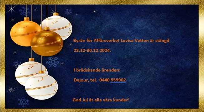 20.12.2024 Affärsverket Lovisa Vatten meddelar: Byrån är stängd 23.–30.12.2024 Vid brådskande ärenden, kontakta Affärsverket Lovisa Vatten dejour på tel. 0440 555 902. Dela: Länken har kopierats till urklipp