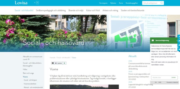 30.05.2022 Nu kan du få socialrådgivning även via chatt på webbplatserna för Östra Nylands kommuner Östra Nylands kommuner kompletterar sin socialrådgivning med en ny chattjänst. Socialtjänsternas rådgivningschatt finns redan på Askolas, Lappträsks, Lovisas och Sibbos webbplatser och den är avsedd för invånare i dessa kommuner. Tjänsten börjar också i Borgå senare under sommaren. Socialtjänsternas rådgivningschatt hjälper i frågor om socialtjänster för barn, familjer, personer i arbetsför ålder, äldre och personer med funktionsnedsättning samt missbruks- och mentalvårdstjänster. Rådgivningschatten, och vid behov även en klientrådgivare, svarar på frågor om exempelvis olika slags stödtjänster samt ansökan om förmåner och stöd. Chattjänsten fungerar på kommunernas webbplatser och den kan också användas i mobila enheter. Chattbotten svarar på klienternas frågor på finska och svenska dygnet runt, alla dagar om året. Klientrådgivaren är anträffbar på måndagar klockan 12–16 och från tisdag till torsdag klockan 9–11 och 12–14. – I chattjänsten är det lätt att söka råd till exempel hemifrån och den tid som passar en själv. På så sätt kan klienten själv ha kontroll över sin situation och söka hjälp på ett flexibelt sätt. Utvecklandet av nya digitala tjänster siktar samtidigt på att utveckla och standardisera social- och hälsovårdstjänsternas verksamhetssätt inom Östra Nylands välfärdsområde så att tjänsterna är tillgängliga för alla. På så sätt förbättras även verksamhetens produktivitet och effekt, säger Jaana Forslund, projektledare för kommunernas gemensamma social- och hälsovårdsreformsprojekt. Dela: Länken har kopierats till urklipp