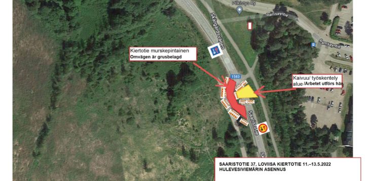 09.05.2022 Omväg på Skärgårdsvägen öppnas onsdagen 11.5.2022 på grund av vägarbeten En omväg öppnas på Skärgårdsvägen onsdagen 11.5.2022 under tiden då avlopp för dagvatten installeras och ett rör dras under vägen. Omvägen öppnas efter att morgonens arbetsplatstrafik minskar. Arbetet utförs litet söder om korsningen av Ramsayvägen. Arbetet beräknas ta två dygn. Mer information: Markus Lindroos, infrastrukturchef, tfn 050 382 7550, markus.lindroos@loviisa.fi Dela: Länken har kopierats till urklipp