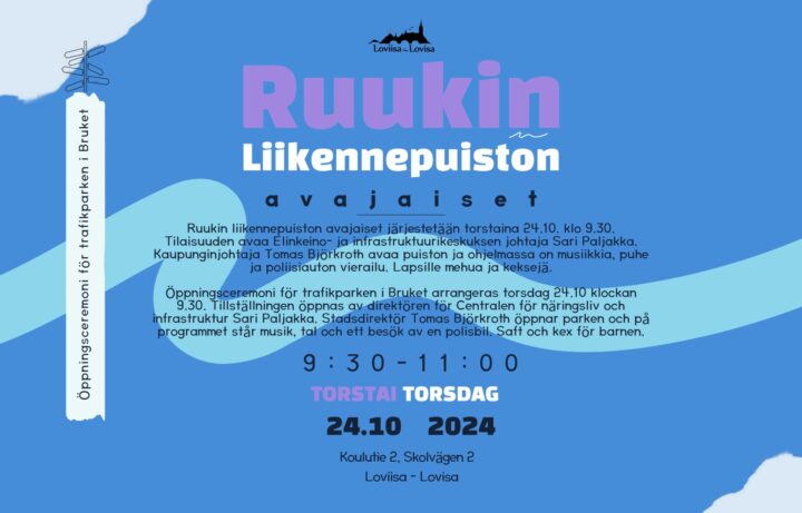 14.10.2024 Öppningsceremoni för trafikparken i Bruket arrangeras torsdag 24.10 klockan 9.30. Välkommen! Öppningsceremoni för trafikparken i Bruket arrangeras torsdag 24.10 klockan 9.30. Tillställningen öppnas av direktören för Centralen för näringsliv och infrastruktur Sari Paljakka. Stadsdirektör Tomas Björkroth öppnar parken och på programmet står musik, tal och ett besök av en polisbil. Saft och kex för barnen. Evenemanget ordnas av Lovisa stads kulturtjänster Jahkob Tjäder Kulturproducent Lovisa stadTel. 040 751 7449 Trafikparkens adress: Skolvägen 2, 07970 Lovisa Välkommen! Dela: Länken har kopierats till urklipp
