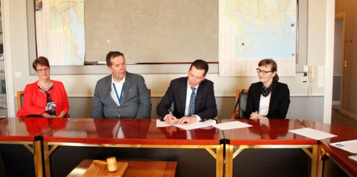 15.04.2019 Ramavtalet om att ordna bostadsmässa 2023 i Lovisa har undertecknats Andelslaget Finlands Bostadsmässa och Lovisa stad undertecknade måndag 15.4.2019 på Lovisa Rådhus ett ramavtal om att ordna en bostadsmässa i Lovisa 2023. I ramavtalet redogörs det om samarbetet mellan Andelslaget Finlands Bostadsmässa och Lovisa stad vid ordnandet av mässan. I ramavtalet överenskoms det om uppdelningen Andelslaget Finlands Bostadsmässa och Lovisa stad emellan av de ansvar och uppgifter som anknyter till bostadsmässan. På Andelslaget Finlands Bostadsmässas vägnar undertecknades avtalet av verkställande direktör Anna Tapio och operativ direktör Heikki Vuorenpää och på Lovisa stads vägnar av stadsdirektör Jan D. Oker-Blom och direktören för stadskanslicentralen Kristina Lönnfors. – I höstas beslöt andelslagets styrelse att bevilja Lovisa bostadsmässan för 2023 och nu efter att vi har undertecknat avtalet kan vi till nästa välja en projektchef. Projektchefen kommer sedan att börja driva projektet framåt, berättar operativ direktör Heikki Vuorenpää från Andelslaget Finlands Bostadsmässa. Bostadsmässan ordnas på Drottningstranden på Lovisavikens östra strand, under en kilometer från Lovisa torg. Områdets planläggningsarbete pågår. Mässtomterna kan ansökas tidigast på våren 2021. Ansökningstiden för projektchefsposten slutar 30.4.2019. – Lovisa är känd för byggande i trä och för sin gemenskap. Med hjälp av bostadsmässan förstärker vi dessa styrkor. I planeringen av Drottningstranden förbinder vi oss till det bästa användarorienterade smarta byggandet som tillgänglig teknologi tillåter och till mångsidigt modernt byggande i trä, konstaterar Lovisa stads stadsdirektör Jan D. Oker-Blom. Ytterligare information: Heikki Vuorenpää, operativ direktör, Andelslaget Finlands Bostadsmässa, tfn 050 531 67 76, heikki.vuorenpaa@asuntomessut.fi Jan D. Oker-Blom, stadsdirektör, Lovisa stad, tfn 040 551 75 51, jan.d.oker-blom@loviisa.fi Dela: Länken har kopierats till urklipp