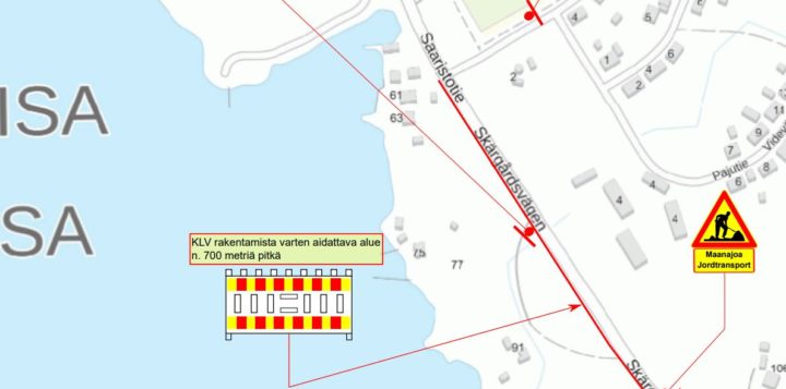 05.01.2021 Skärgårdsvägens körfil i riktning söderut stängs för trafik från Alvägens korsning cirka 700 meter framåt under perioden 11–28.1.2021 på grund av vägarbeten Byggandet av infran på Drottningstranden löper bra. På måndag 11.1.2021 börjar byggandet av lättrafikleden samt vatten och avlopp längs med Skärgårdsvägen. För att garantera säkerheten bygger man upp ett stängsel runt området. Skärgårdsvägens körfil i riktning söderut är avstängd för trafik från Alvägens korsning cirka 700 meter framåt under perioden 11–28.1.2021 på grund av vägarbeten och trafiken styrs till den andra körfilen med trafikljus. Även hastighetsbegränsningarna sänks på området. Byggandet av infran på Drottningstranden började i november 2020. Här tills har maskinerna i huvudsak arbetat på det kommande bostadsområdet. Mer information: Entreprenör Infrastar Oy, Petteri Pakarinen, tfn 040 526 6731Lovisa stad, infrastrukturchef Markus Lindroos, tfn 050 382 7550 Dela: Länken har kopierats till urklipp