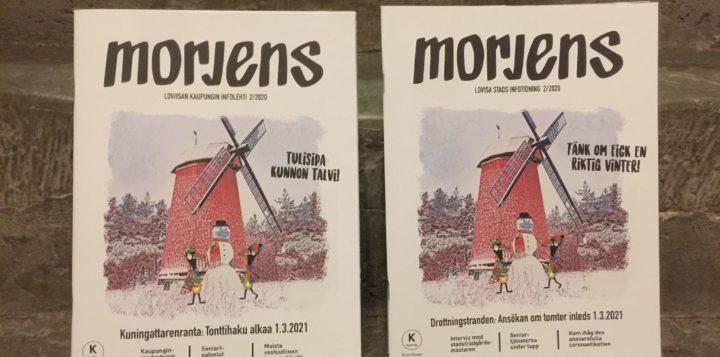 10.12.2020 Stadens infotidning Morjens delas ut till Lovisahushåll 10.12.2020 Den nya upplagan av Lovisa stads infotidning Morjens delas ut som offentligt meddelande med dagsposten till alla hushåll på torsdag 10.12.2020. I tidningens höstnummer skriver vi bland annat om Drottningstrandens tomtansökning, trafiksäkerheten och budgeten för 2021. Om du av någon orsak blir utan tidningen kan du kontakta Lovinfo på telefonnumret 019 555 555 eller per e-post på lovinfo@loviisa.fi, så skickar vi dig ett exemplar. Du kan även hämta tidningen på Lovinfo på Mariegatan 12 A. Från och med vecka 51 finns det senaste numret på huvud- och närbiblioteken och i bokbussen. Den elektroniska tidningen (pdf) hittar du här. Dela: Länken har kopierats till urklipp