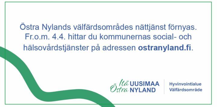 04.04.2023 Uppgifterna om social- och hälsotjänster flyttar i sin helhet 4.4.2023 till adressen ostranyland.fi Webbplatsen för Östra Nylands välfärdsområde ostranyland.fi omfattar från och med 4.4.2023 alla social- och hälsotjänster för invånarna i vårt område. Uppgifterna om social- och hälsotjänsterna stryks från Lovisa stads webbplats lovisa.fi. Vid ingången av 2023 öppnades en mindre omfattande webbplats för välfärdsområdet. På webbplatsen berättades det basuppgifter om välfärdsområdet, där fanns aktuella ärenden och lediga arbetsplatser och det berättades om förvaltningen och beslutsfattandet. Från och med 4.4 hittar du alla uppgifter om social- och hälsotjänsterna på webbplatsen för Östra Nylands välfärdsområde ostranyland.fi. Uppgifterna för Räddningsverket i Östra Nyland finns även i fortsättningen på adressen iupela.fi. Dela: Länken har kopierats till urklipp