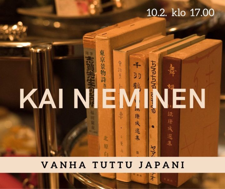 04.02.2020 Kai Nieminen pääkirjastossa ma 10.2. klo 17.00: Vanha tuttu Japani Luento japanilaisesta kirjallisuudesta Suomi ja Japani solmivat diplomaattisuhteet vuonna 1919, mutta jo sitä ennen Suomen suuriruhtinaskunnassa oli tunnettu syvää kiinnostusta Japaniin. Oman mausteensa asialle antoi Japanin–Venäjän sota, jonka aikana monet suomalaiset toivoivat menestystä tsaarin vihollismaalle Japanille. Japania koskevaa kirjallisuutta ja lehtiartikkeleita oli julkaistu vuosisadan vaihteesta lähtien sekä suomeksi että ruotsiksi. Luennossa kerrotaan japanilaisesta kirjallisuudesta Suomessa ennen itsenäisyyttä ja siitä lähtien nykypäivään saakka. Jaa: Linkki kopioitu leikepöydälle
