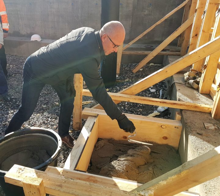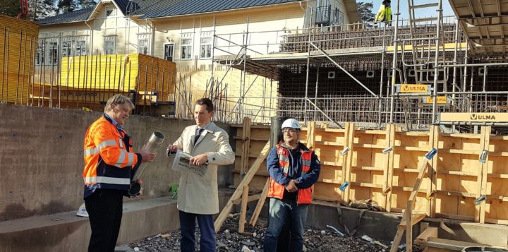 01.10.2018 Koskenkylän koulun peruskivi muurattiin aurinkoisessa säässä Uusi koulukeskus Loviisan Koskenkylässä rakentuu hyvää vauhtia. Koulun peruskivi muurattiin maanantaina 1.10.2018. Koskenkylän koulukeskus rakennetaan hirrestä betonista väestösuojaa lukuunottamatta. Rakentajien arvion mukaan hirsitöihin päästään marras-joulukuun vaihteessa 2018. Peruskiven muuraukseen osallistui rakentajan ja valvonnan edustajien ohella kaupungin viranhaltijoita ja luottamushenkilöitä. Peruskiveen asetettuun kapseliin laitettiin muun muassa kolikkoja, päivän paikallislehdet sekä rakennuspiirustukset. Kapselin piilotti ja ensimmäisen laastikauhallisen heitti kaupunginjohtaja Jan D. Oker-Blom. Lisätietoa Koskenkylän koulukeskuksen rakennushankkesta Koskenkylän koulun rakennustyömaa lokakuun alussa 2018. Väestönsuoja valetaan betonista, loput rakennetaan hirrestä. Koulutuspäällikkö Timo Tenhunen omisti laastikauhalliset oppilaille, opetushenkilökunnalle ja koulun iltakäyttäjille. Koulujen rehtorit Helena Järventaus ja Katja Smeds heittivät yhteiset kauhalliset. Sivistysjohtaja Thomas Grönholm, tilapäällikkö Antti Kinnunen ja rakennuttajainsinööri Pia Rajala iloisissa tunnelmissa. Jaa: Linkki kopioitu leikepöydälle