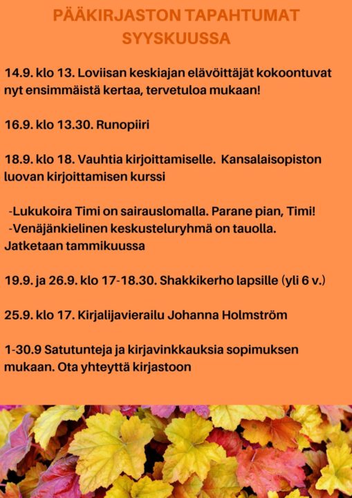 07.09.2019 Pääkirjaston tapahtumat syyskuussa Pääkirjastossa tapahtuu syyskuussa Jaa: Linkki kopioitu leikepöydälle
