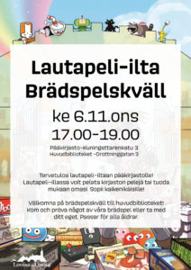 31.10.2019 Peliviikkoa vietetään Loviisan pääkirjastolla 4.-10.11.2019 Tervetuloa lautapeli-iltaan pääkirjastolle! Kirjaston lautapeli-ilta järjestetään keskiviikkona 6.11. kello 17-19. Lautapeli-illassa voit pelata kirjaston pelejä tai tuoda mukaan omasi. Sopii kaikenikäisille. Peliviikolla 4.-10.11.2019 järjestetään satoja avoimia tapahtumia eri puolilla Suomea ja muissa pohjoismaissa, joissa pelataan esimerkiksi lautapelejä, roolipelejä, konsolipelejä, mobiilipelejä ja tietokonepelejä, sekä tutustutaan pelikulttuuriin luentojen ja työpajojen muodossa. Jaa: Linkki kopioitu leikepöydälle