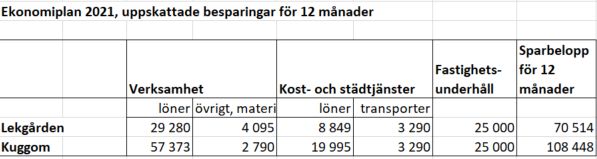 Nedan finns två tabellpar där den kalkylerade besparingen är fördelad per skola/per daghem och innehåll. Den första tabellen i paret gäller besparingen 2020 och omfattar hösten (fem månader), från augusti till och med december. Den andra tabellen i paret innehåller den kalkylerade inbesparingen för ett helt år. Summorna i kolumnen skolskjutsar har minus-förtecken. Vi har reserverat summorna för en eventuell ökning av skolskjutskostnaderna och beloppen minskar därmed på den kalkylerade besparingen.