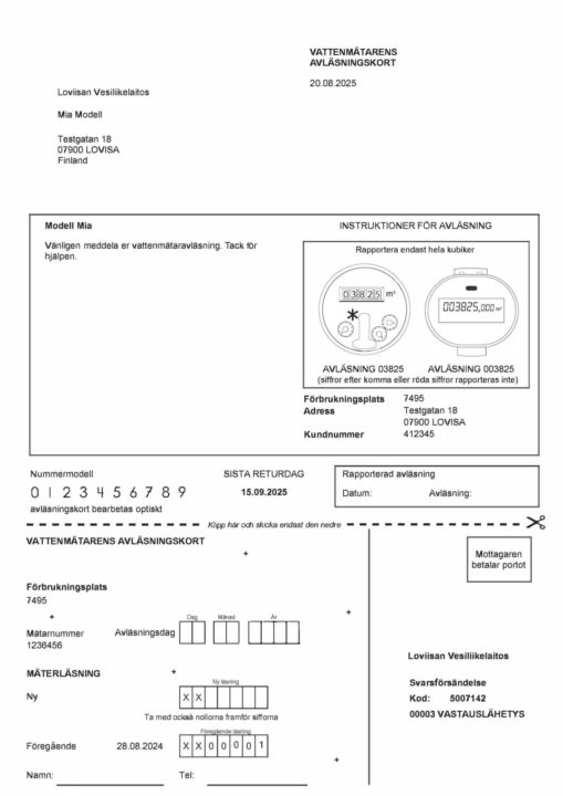 Du kan också rapportera vattenmätaravläsningen genom att skicka e-post till: vattenfakturering@loviisa.fi, vesilaskutus@loviisa.fi eller per telefon 019 555 225 kl. 9.00-15.00.